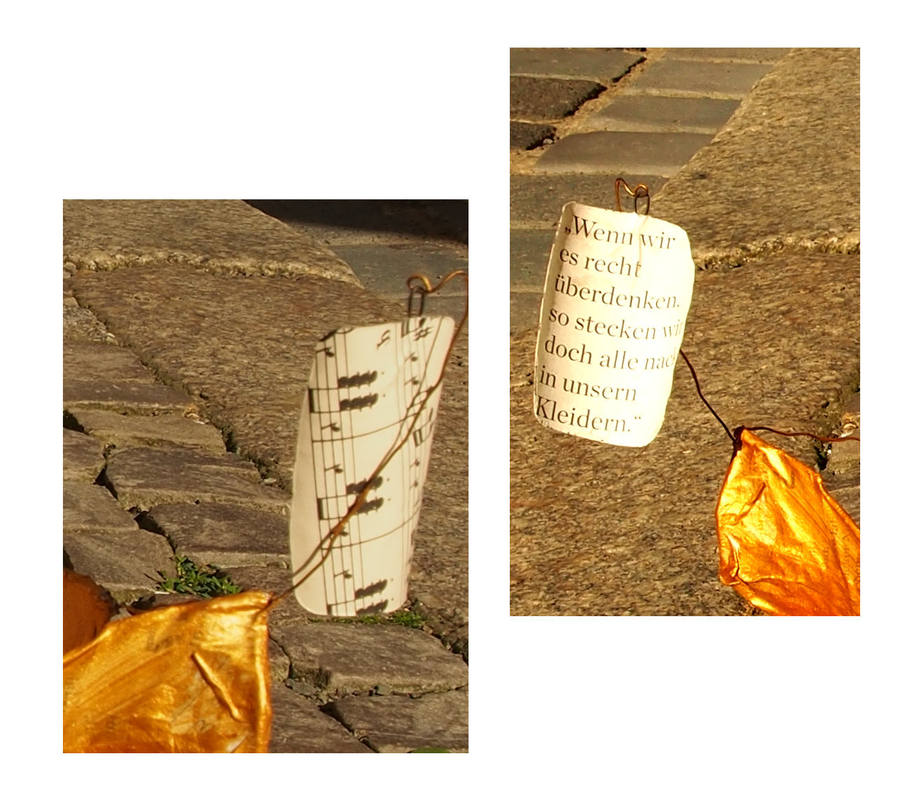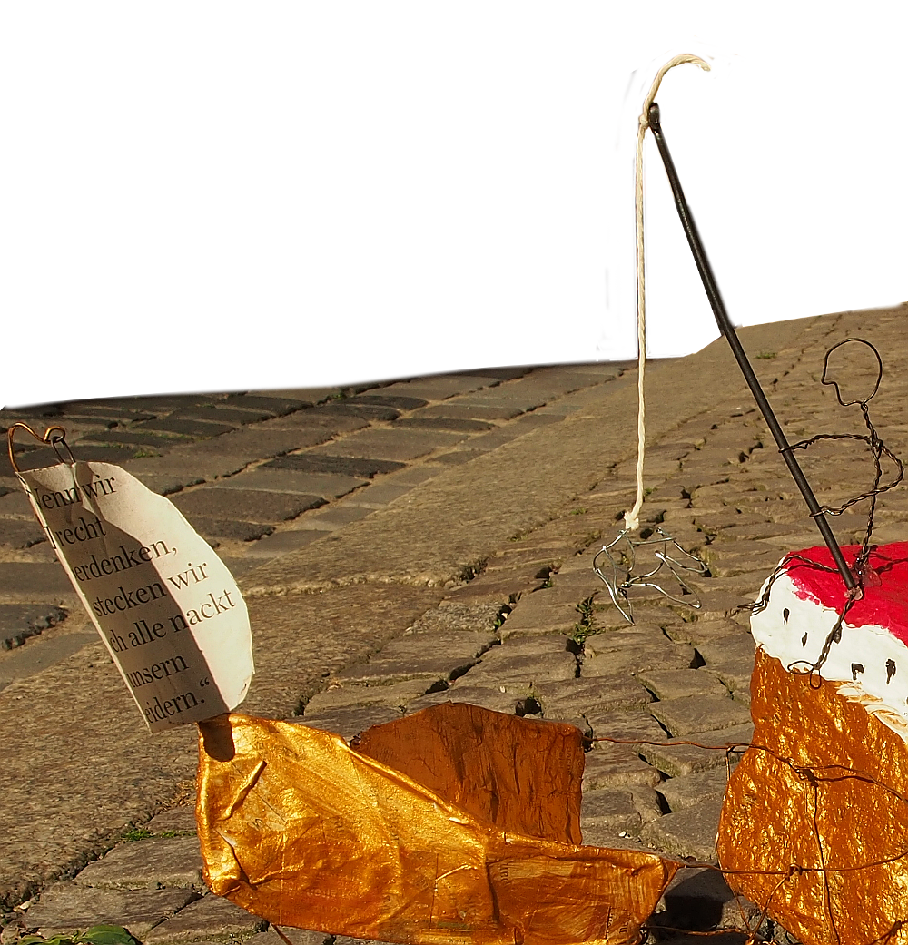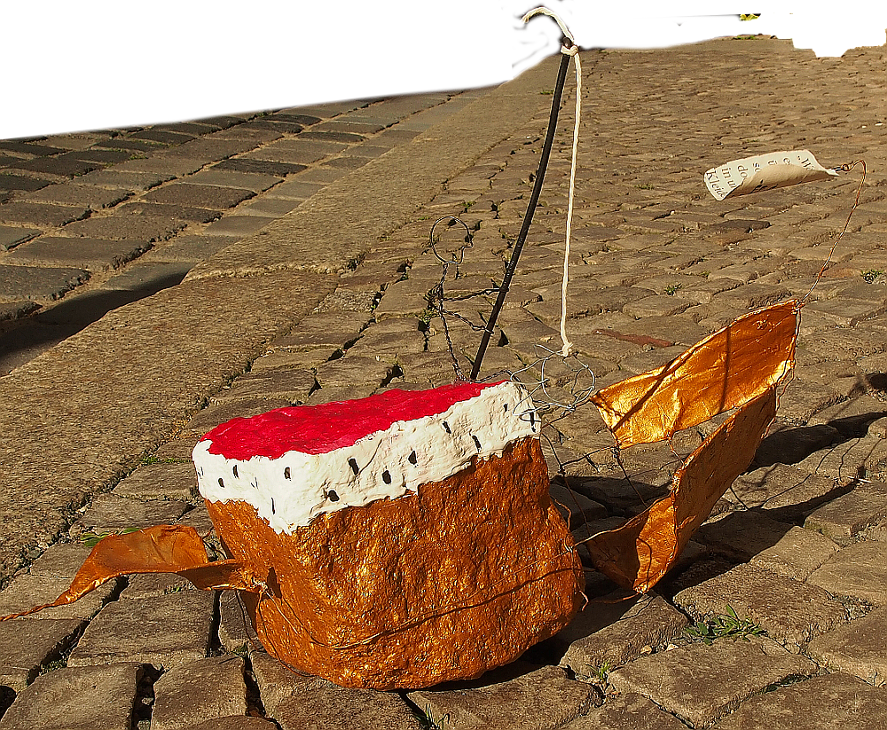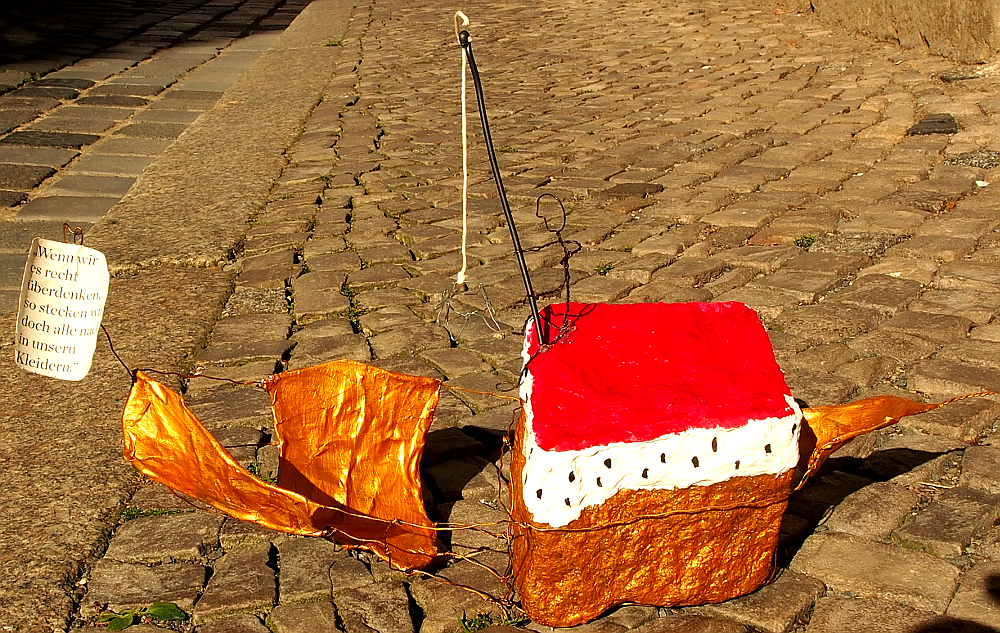Der Pflasterstein selbst ist in einen mit weißem Hermelin besetzten Königsmantel "gekleidet" und hat einen vergoldeten Schiffskörper aus Draht und Papier bekommen.