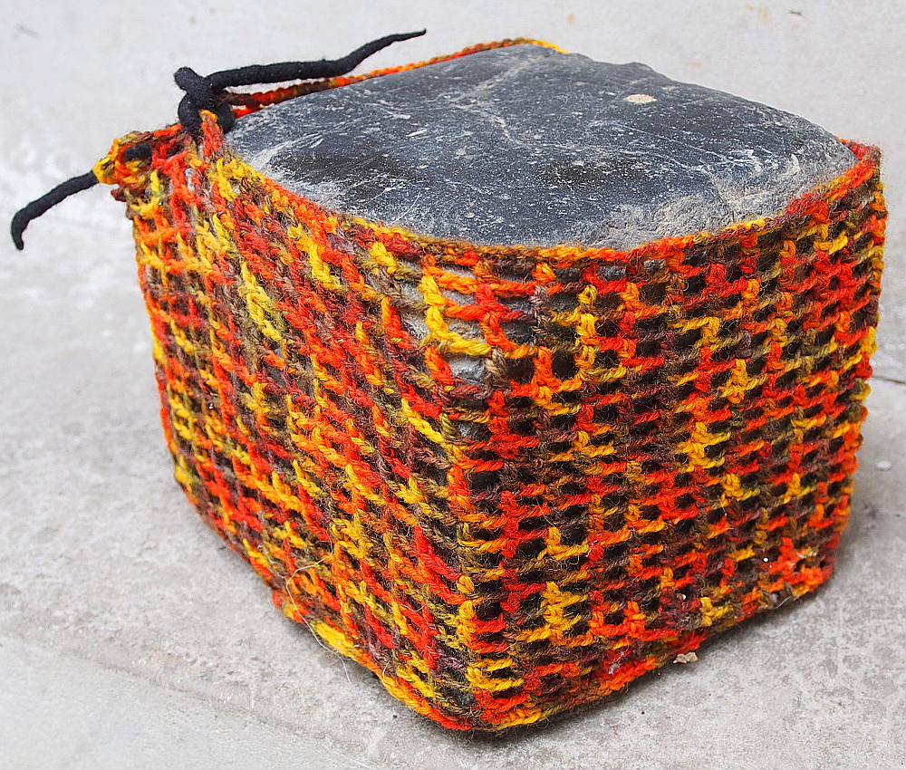 Anja-Maria Plieske Guerilla Knitting ein Projekt mit Pflastersteinen Dieser von Anja Plieske umhäckelte Pflasterstein bezeugt seine Sympathie zur weltweiten Bewegung des Guerilla Knittings. (Ausführlicher Text folgt)